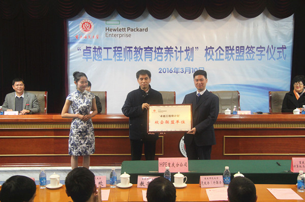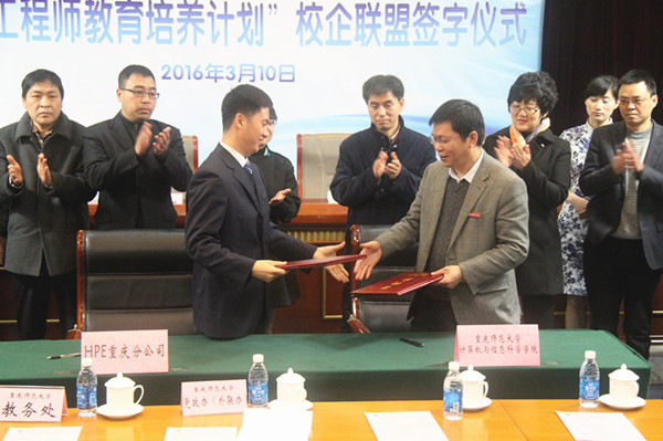 2016年3月10日下午,重庆师范大学与HPE重庆分公司(前身是上海惠普有限公司重庆分公司)“卓越工程师教育培养计划”校企联盟暨HPE“卓越班”培养计划的签字仪式在重庆师范大学凯撒学术报告厅隆重举行,这标志着重庆师范大学与HPE重庆分公司校企联盟正式建立,共同开启了校企合作创新人才培养、科技成果转化与应用的互惠共赢之路。