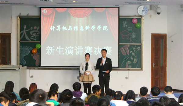2014年11月27日15时许,以“迈好大学第一步,走好成功人生路”为主题的新生演讲决赛在弘德楼5105隆重举行。本次比赛由14级计科1班班长和14级信管班长担任主持人。到场的评委及嘉宾有计信麻将游戏网页版