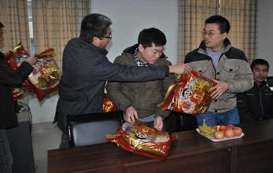 的成长添砖加瓦。接着,各位老师与同学们作了亲切交谈,详细了解了同学们的家庭基本状况、学习情况、在校生活情况。最后,领导老师们一起给同学们送上了新年的祝福和小礼物,祝愿大家能够与家人度过一个欢乐、温暖、祥和的春节。