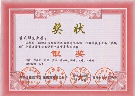 同学共同组队筹备的挑战杯项目“扭动我心校园网络传媒有限公司”获得重庆市银奖的好成绩。在此对指导两个项目的吴强、刘云杰老师以及同学们表示热烈地祝贺!对两位老师的辛勤付出表示衷心地感谢。