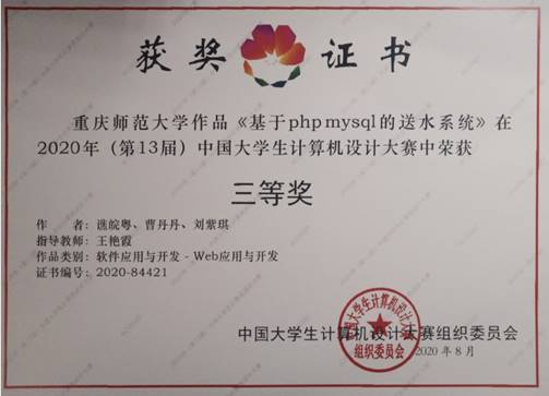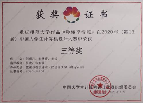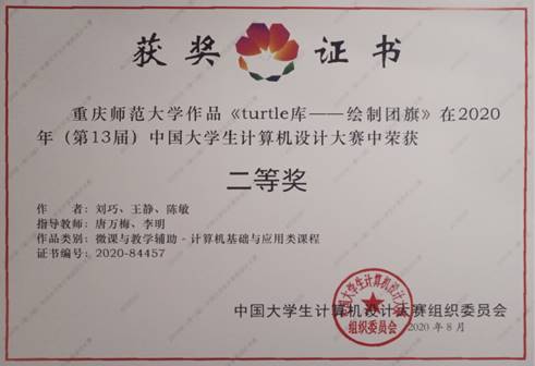 荣获2个二等奖,4个三等奖。由刘巧、王静、陈敏创作,唐万梅老师、李明老师指导作品《turtle库-绘制团旗》,由阳小丽、张雪莲、张贤迪创作,兰晓红老师、孙苗老师指导的作品《智多桶》荣获二等奖。《明兴书城商业网站》、《秒懂李清照》、《挑战扩句山》、《基于php-mysql的送水系统》四个作品荣获三等奖。