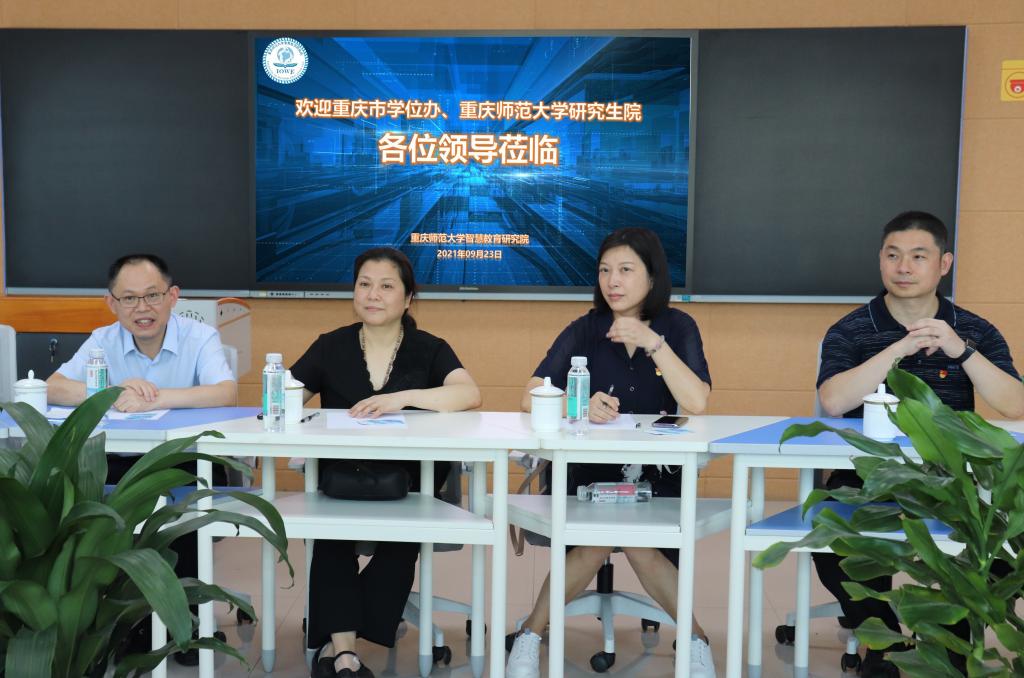 实验室考察结束,在研究院的智慧研讨室举行了由市学位办、学校研究生院和智慧教育研究院的共同参加的研讨会议,会议上,市学位办领导介绍了目前全国学科建设情况,重庆市在“十四五”学科建设的思路与举措,大家就如何推进高校学科建设、打造特色和亮点等问题进行了研讨的交流。