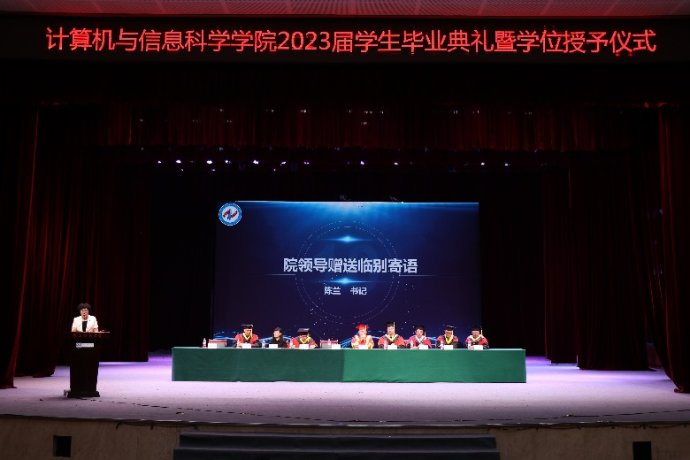 2023届研究生代表潘菊同学进行发言,她表示同学们应与时代同频共振,在挑战中塑造理想信仰,在奋斗中共筑计信精神,书写了新时代青年勇挑重担的青春诗篇。2023届本科生代表成天浩同学鼓励计信学子们在新时代改革开放的广阔天地中勇敢绽放,一定会在各行各业发光发热。教师代表罗凌老师将“祝贺”、“爱护”、“期待”三个词送以全体毕业生表达了美好期盼和良好祝愿。