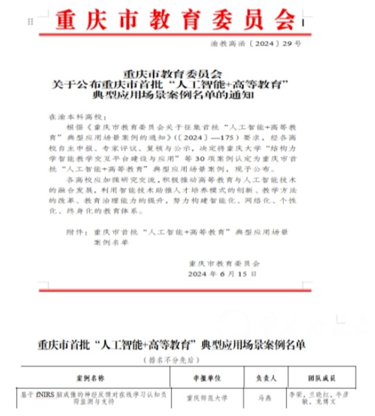 根据重庆市教委渝教高函〔2024〕29号的文件,我校智慧教育研究院马燕教授所带领团队申报的“基于fNIRS脑成像的神经反馈对在线学习认知负荷监测与支持”项目获得重庆市首批“人工智能+高等教育”典型应用场景案例。