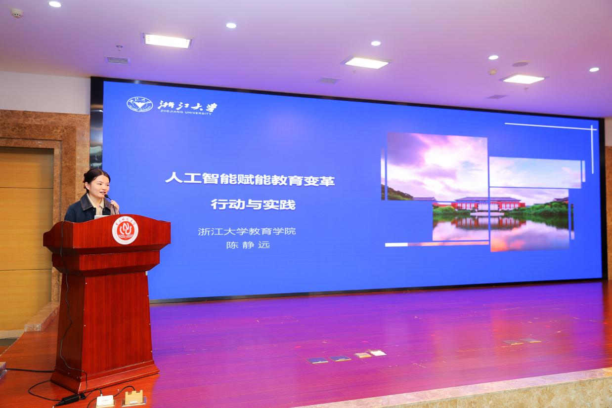 陈静远研究员作了题为《人工智能赋能教育变革行动与实践》的报告,她谈到,人工智能具有至小有内、至大无外的特点,呈现多学科交叉综合、渗透力和支撑性强、高度复杂以及技术属性和社会属性高度融合等内禀,介绍了从“厚基础、强交叉、养品行、促应用”角度介绍人工智能课程在计算机课程中的起源和现状,计算机领域本科教育教学改革试点工作计划(“101”计划)的基本情况,以及浙江大学人工智能赋能教育实践的有关情况。