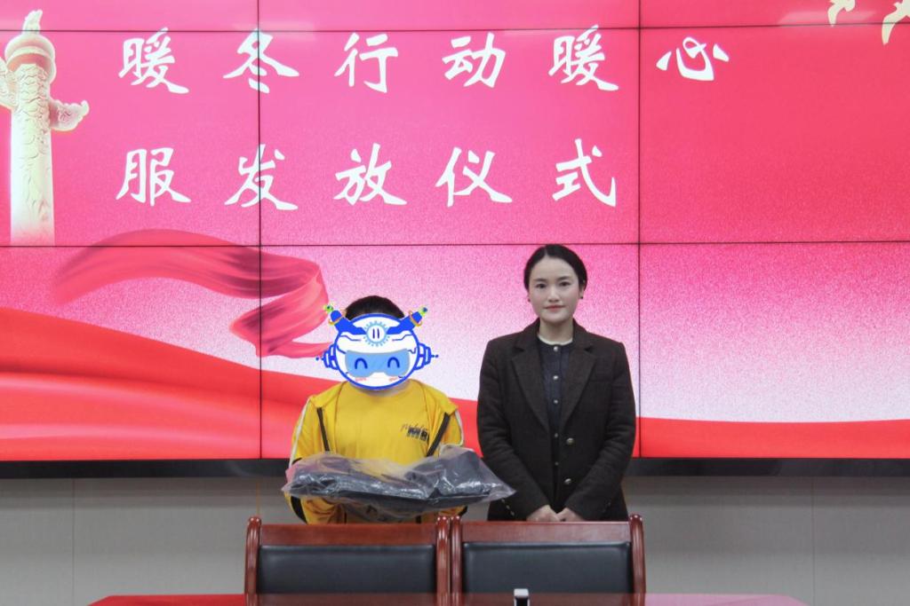 不仅要开展对同学们能力的培养更要关心同学们成人成才路上的需求,解决急难愁苦,同时,培养同学们的社会责任感。“暖冬行动”不仅是一项承诺,更是践行人文关怀、传递友善和责任的注脚。希望通过这一活动为同学们提供物质帮扶,给予大家继续前行的力量。暖心服发放仪式中,三位老师将厚实温暖的衣物送到每一位同学手中,并与同学们合影留念。