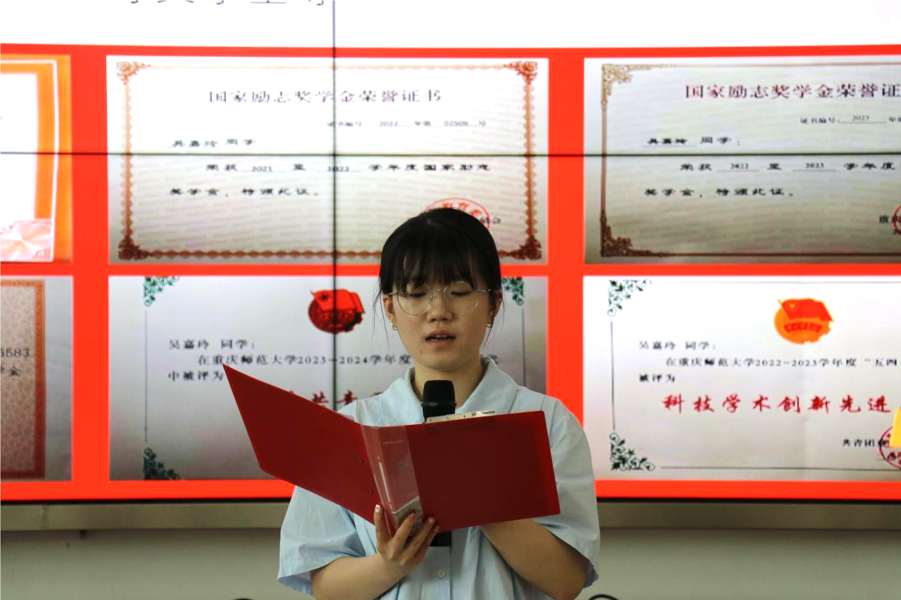人才培养目标,从锤炼专业素养、厚植文化底蕴、践行社会责任等维度出发,对全体师生提出三点殷切期望:一要“广读博学夯基础”,在专业领域深耕细作,筑牢知识根基;二要“跨界阅读促交叉”,打破学科壁垒,在融合创新中开拓视野;三要“心怀家国读经典”,从红色著作中汲取精神力量,将个人成长融入国家发展大局。活动中,青年马克思主义者培养工程成员朗诵《红岩魂》,以铿锵有力的声音将展演活动的氛围推向高潮,展现了计信学子昂扬向上的精神风貌。在“老师说”环节,曹正然老师向同学们推荐书籍《数学之美》与《浪潮之巅》,希望计信学子带着“止于至善”的追求,让人工智能不只是冰冷的算力,更成为温暖人心的力量;用"亲民"的智慧,让技术扎根本土需求,在科技强国的路上踏出实实在在的脚印。2021级优秀学生代表杨云博、吴嘉玲结合自身经历,分享了高效学习方法和时间管理经验。校友贾磊磊通过讲述他的成长经历和职场经验,启发学弟学妹们“勇于尝试、敢于突破”。