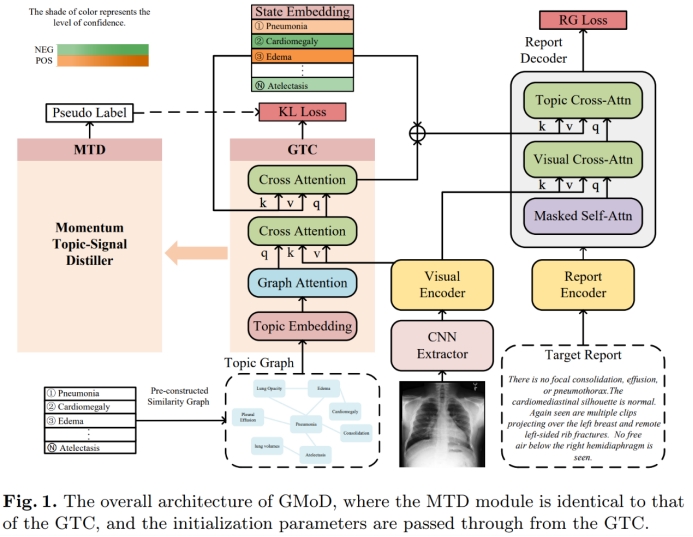 该研究面向智慧医疗场景,采用生成式人工智能及多模态机器学习实现了胸部X光片的影像报告自动化智能生成。研究组观察到现有方法使用疾病分类辅助报告生成的多任务学习忽略了疾病严重程度,因此提出了图驱动的动量蒸馏(GMoD)框架来主动引导模型关注疾病严重程度这一重要信息。GMoD框架提出了基于图的主题分类器(Graph-based Topic Classifier, GTC)和动量主题信号蒸馏器(Momentum Topic-Signal Distiller, MTD)两大新型网络模块。具体来说,GTC 模块结合常见肺部疾病和症状构建主题图,在进行多标签分类时关注它们之间的潜在联系。而MTD模块通过构造伪标签来约束模型关注疾病是阴性还是阳性的置信度,然后将图像和多标签分类结果共同输入解码器协助模型感知联合特征,从而生成更准确的报告。