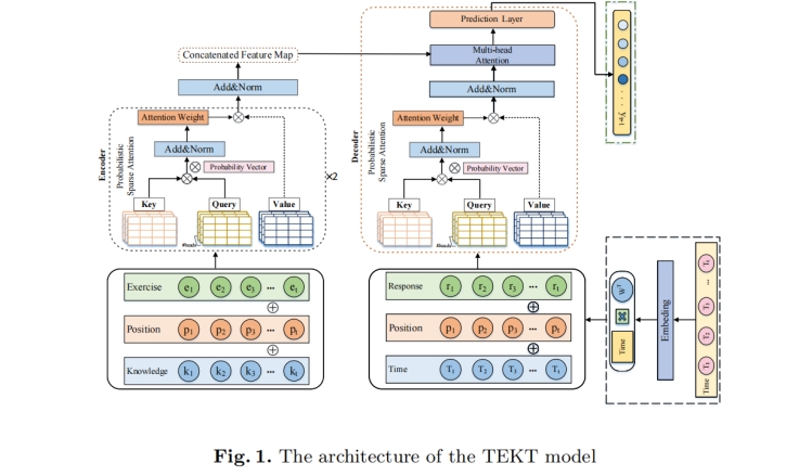 该研究面向智慧教育场景,以教育大数据智能分析与挖掘技术为基础,运用人工智能方法对学生学习过程中的知识状态进行追踪。具体来讲,基于对学生学习、练习和测试的历史数据进行分析来对学生知识掌握情况进行建模,从而得到学生当前知识状态表示的方法。该方法在计算机辅助教育和适应性学习研究中发挥着重要作用。在学习者的学习过程中,随着学习时间的增加,学习者的历史学习记录之间的时间距离持续增加,导致在练习中捕捉知识概念的相关性时出现长期依赖问题。此外,学习者的学习状态也受到时间的影响。如何准确地判断学习者在不同时间层次上的知识状况也是一个挑战。为了解决上述问题,课题组提出了一种时间增强的知识跟踪模型(TEKT)。一方面,利用概率稀疏注意机制解决了长期依赖的问题;另一方面,通过嵌入细粒度的时间特征来捕获学习者在不同时间粒度下的知识状态。本文提出的方法已经在不同数据集上进行了实验和验证。结果表明,所提出的模型在多个性能指标上表现出了良好性能。