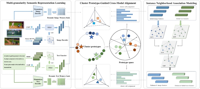 该研究针对现有图像-文本匹配方法在处理语义歧义和高阶关联建模中的不足,提出了一种歧义感知与高阶关系学习框架。首先,通过动态聚类与原型对比学习构建统一表征空间,有效解决了语义相似样本的误匹配问题;其次,设计全局-局部特征协同提取机制与自适应聚合网络,显著提升了多粒度语义理解能力;进一步引入多模态语义关联图与图神经网络,深度挖掘样本间的邻域关系,同时结合动量对比学习策略扩展负样本集,显著提升了模型的判别能力。实验表明,该方法在多个基准数据集上均取得最优性能,展示了良好的泛化能力和实际应用价值。完整代码及预训练模型已开源。