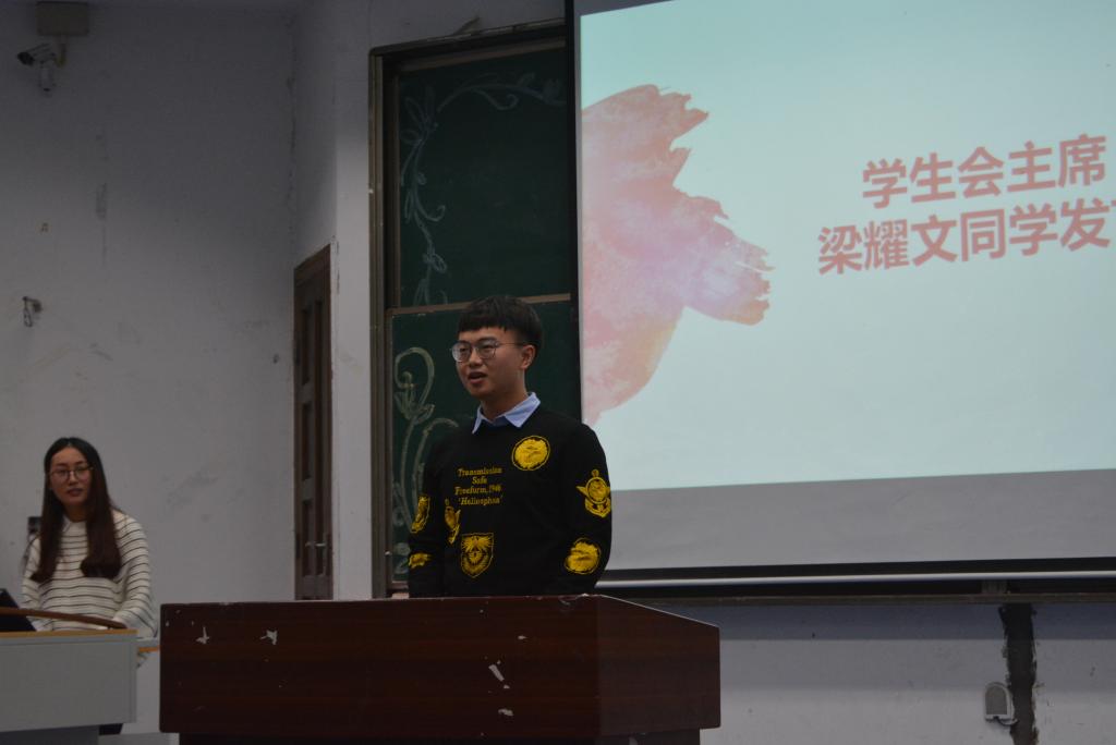 第九届团学会主席梁耀文就本次成立大会发表了自己的感想。这已经是他在团学会工作的第三年,他把团学会当成一个大家庭,每一位成员都是自己的家人。深情的语言感染着在场的每一个人。