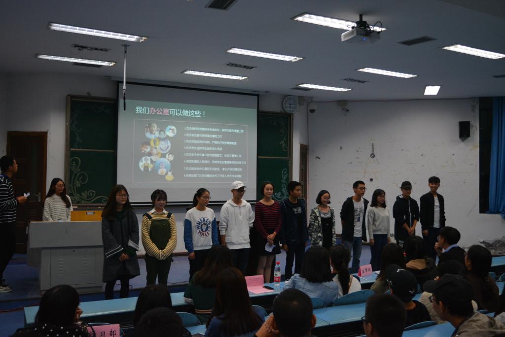 在这之后,大家观看了一段由团学会干部所拍摄的视频。幽默诙谐的风格调动起全场气氛,现场掌声不断。随后,每个部门的成员依次上台介绍自己的部门,出其不意的介绍方式和表演让人捧腹大笑,笑声中无形增进了大家的紧密度和团结性。最后,干事代表胡成涛同学进行了发言,代表所有新成员表明决心,成立大会到此结束。