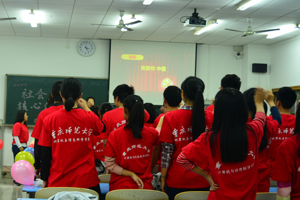 在主持人林小健、李小晴激情开场:“只要爱国、敬业、诚信、友善,就有希望让社会变得自由、平等、公正、法制,而国家才会更加富强、民主、文明、和谐。“接下来,由主持人带领大家合唱的歌曲《我爱你中国》可谓是激情飞扬,它真挚地表达了同学们对祖国的热爱。随后,主持人介绍了由习近平总书记提出的“四进四信”的基本含义,四进即“进社团、进支部、进团课、进网络”,四信即“信仰、信念、信任、信赖”。同时,同学们还表演了一段四进四信版“小苹果”舞蹈,收获了观众无数掌声与欢笑的同时,更在愉悦中让大家加深了对“四进四信”的记忆。活动接近尾声时,同学们玩了猜字和抽学号答学习心得的游戏。同学们纷纷表达了这次活动不仅有欢笑,更有收获。最后,师生合影留住了难忘瞬间,也为此次活动画上圆满的记号。