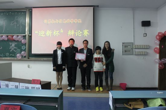 颁奖仪式上,信管队获得了“优秀辩队”的称号,季军:软工队,亚军:电商队,冠军:计科队,观众们用极其热烈的掌声对他们表示了祝贺,辩手们还一起合影留恋!辨出水平,论出风格!好一场火药味十足的辩论赛,无论结局如何,重要的是同学们在这过程中锻炼了自己,提升了自己,至此,迎新杯辩论赛圆满结束。
