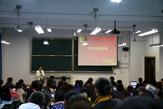 活动于6:30正式开始,首先,09级辅导员朱嘉洁老师为本次支部达标活动致辞,明确指出,支部达标不是团支书一个人的事情,其中还凝聚着班级中每一位同学的辛勤付出与努力。接着,每位团支书以PPT为辅助工具进行5分钟的述职演讲。早在一周多前,同学们已经开始准备班级支部达标材料和精彩的述职报告,团支书的报告中简单介绍了支部建设的相关制度,并呈现出同学们生活、学习中的点点滴滴,短短5分钟的报告凝聚了同学们2011年的付出和收获。