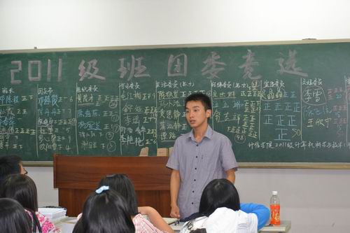 主持人提前到场布置场地,6:30准时进行点名,一一分发选票。首先由主持人做自我介绍,并从竞选流程与计票规则两个方面通告竞选情况。据悉,本届班委选举共设11个职位,分别是班长、团支书、组织委员、学习委员、宣传委员、文娱委员、生活委员(男)、生活委员(女)、纪律委员(男)、纪律委员(女)、体育委员。竞选者就各自竞选的职位进行现场报名演讲,演讲内容大致包括个人简历、工作表现、主要优缺点以及工作设想,大家各尽其能,创意百出,演讲态度或诙谐幽默、或严谨认真,演讲内容或简短精悍、或长篇大论。看得出各竞选者都经过了精心准备,尽情展示新一代大学生的精神风貌。总体看来,最能锻炼能力的班长、团支书两个职位的竞选者居多,其他职位也都有相应的竞选者。
