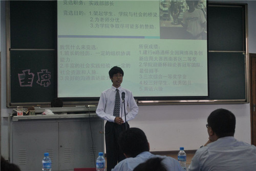 会上,主持人首先对嘉宾评委以及大会流程进行了一一介绍,随后作了本学年度的述职报告,以时间为序指出了本学年所开展的学生活动,与大家分享了自己在活动中的所感、所得,并谆谆告诫作为学弟学妹的学生干部们要勇敢去迎接挑战、创新发展,实现新的辉煌。