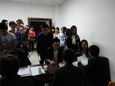 下午2:00,各部门干部提前来到招新现场,做好活动准备。随后,参加面试的2010级新生也陆续到达面试现场,排队等候2:30的正式面试。