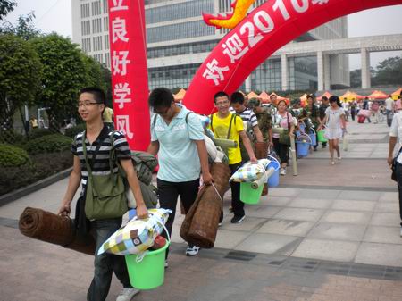 新生接到大本营,将其家长带到休息处,为其送水和扇子,让他们静心等待新生报到完毕归来。然后顶着烈日陪同新生走完所有的报到程序,并帮助他们将领到的物资搬回所属寝室。最后目送新生上到前往军训地点的车上。团总支副书记张敬和所有学生干部则坚守在大本营,及时准确地为新生传达信息和解决疑惑。炎炎烈日无法停止一个个身影的穿梭,汗流浃背亦阻挡不了一张张笑脸的绽放。麻将游戏网页版