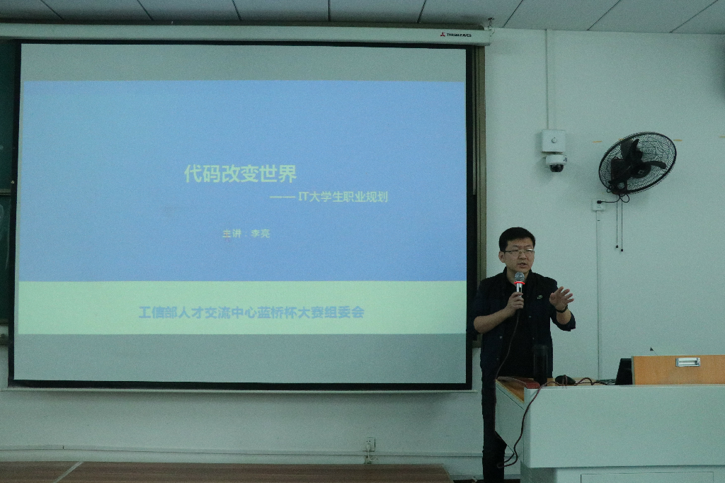 演讲伊始,李亮老师以幽默风趣的语言强调了同学们在大学四年中应该明确人生目标,以及毕业前如何为自己的目标努力奋斗。紧接着,李亮老师对往年的考研数据进行分析,提出了大学生应该充分利用大学的时间,做对未来最有帮助的事情,围绕自己的目标,设定自己的任务的观点。随之,李亮老师提到计算机行业是最严苛的行业,但也是最宽容的行业,他给同学们详细讲述了我国计算机及互联网行业与企业的整体发展情况,和各企业对IT类大学生提供的岗位、岗位要求、职业发展路径,让同学们对计算机行业有了更加深层次的了解。最后,李亮老师就如何进行职业定位与选择职业发展方向进行全面分析,并简述了蓝桥软件麻将游戏网页版
