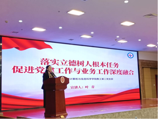 参赛,获得二等奖第一名的好成绩。她以“落实立德树人根本任务,促进党建工作与业务工作深度融合”为题进行理论宣讲。宣讲结合支部工作实际,阐释如何从机制融合、队伍融合、评价融合三方面拓展融合途径,从“党建+课程思政”“党建+科技创新”“党建+服务社会”三个维度创新融合模式,实现“一融双高”的新时代高校党建和事业融合发展思路。在答辩环节,针对案例准确地阐明了党费的使用规则和范围,得到评委的一致认可。本次大赛既是展示风采的舞台,更是互学互鉴的平台。赛事充分展现了我校党支部书记队伍“政治强、业务精、作风正”的优良素质,为推进基层党建高质量发展注入新动能。