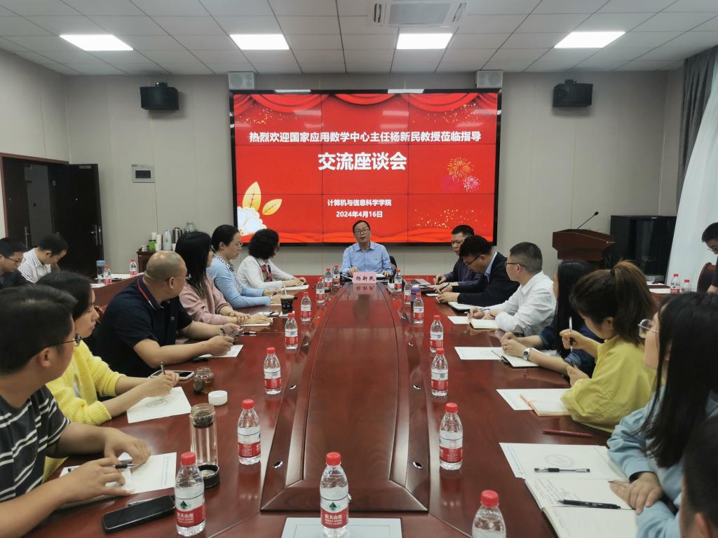 建设和事业发展的关心与支持。随后,杨新民教授介绍了国家应用数学中心(以下简称“中心”)的来历、现状和发展思考,重点介绍了中心的科学研究方向和平台统筹优势以及在行业企业生产发展过程中如何解决关键卡脖子问题的情况。他还根据全国两会精神,分析了当前科技和产业面临的新形势,结合自身经历用轻松幽默的语言,与青年教师生动的讲述了教学、科研尤其是服务产业和地方经济的经验、做法和心得。他强调,要进一步明确定位、梳理优势、强化特色,坚持开放的思想,加强海外人才引进,深化交流互通、共促发展;在人工智能、大模型、大数据等新技术背景下,计算机学科迎来发展机遇,年轻人要抢抓科研机遇,注重学校师范特性,从小切口入手来做好科学研究,为帮助经济社会及产业中难题解决提供智力支撑。